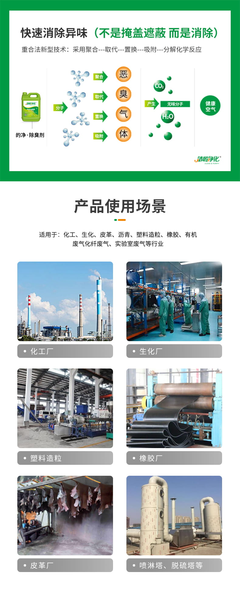 工業(yè)發(fā)展迅速,化工廠也在不斷發(fā)展,化工廠在生產(chǎn)過程中會產(chǎn)生大量的廢氣,比如氨、硫化氫、二氧化硫、甲硫氫、甲硫醇、甲硫醚、二甲二硫、二硫化碳和硫化氫等無機廢氣,還有VOC類:苯、甲苯、二甲苯、丙烯酸、醚類、脂類、醇類、酮類及苯乙烯等有機廢氣。不論有機廢氣還是無機廢氣,他們都有一個共同點,散發(fā)著較大異味。化工廢氣除臭劑可以能與各種有害、異味分子迅速發(fā)生聚合、取代、置換、吸附等化學反應,針對各種廢氣進行吸附,使原有污染氣體 異味分子結(jié)構(gòu)發(fā)生改變,讓空氣變得清新。